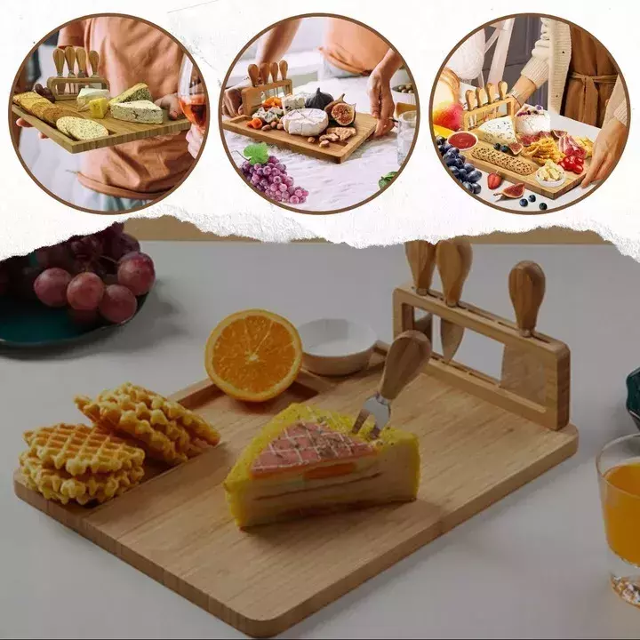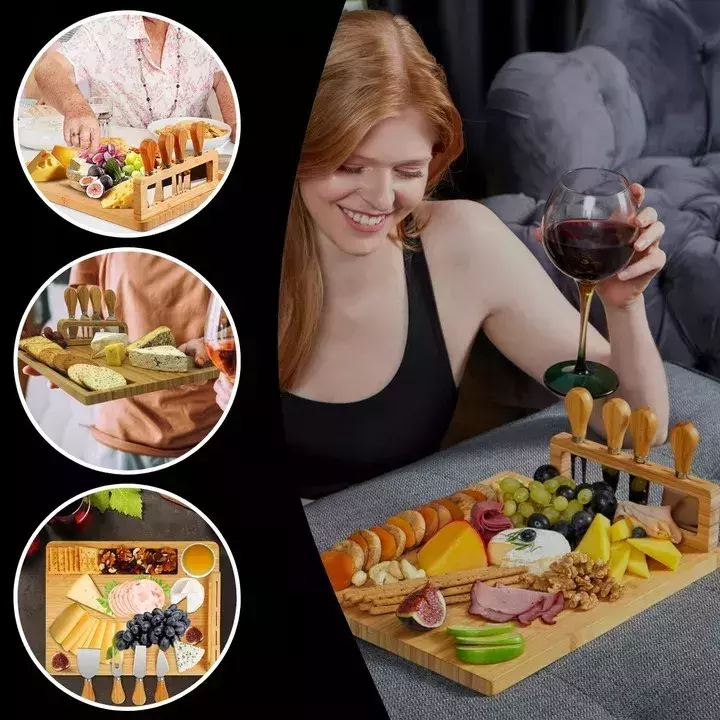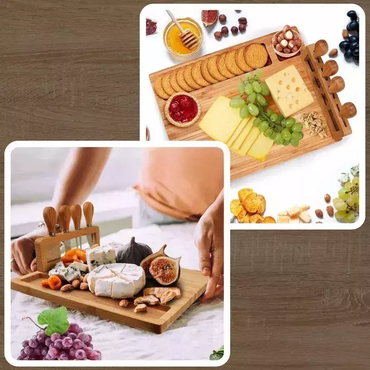 POŁĄCZ WYGODĘ Z PRAKTYCZNOŚCIĄ Dzięki wbudowanemu organizerowi z czterema metalowymi akcesoriami, nasza deska staje się jeszcze bardziej praktycznym narzędziem w Twojej kuchni. Nie musisz się martwić o utrzymanie porządku na stole czy otrzymywanie pochwaleń od gości - to wszystko jest teraz w Twoim zasięgu. Akcesoria pomogą Ci wygodnie nakładać przekąski oraz zachować estetykę podczas serwowania.