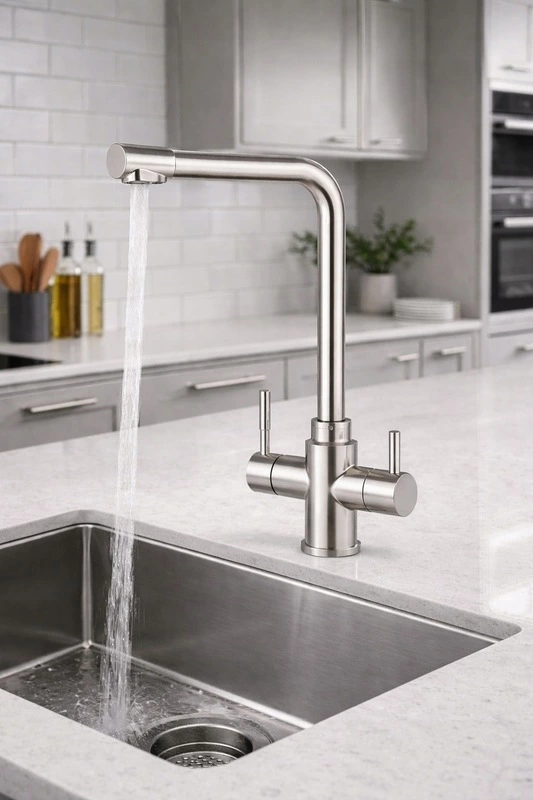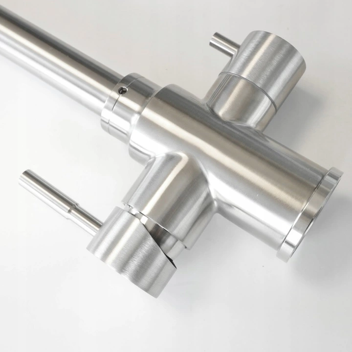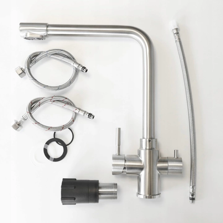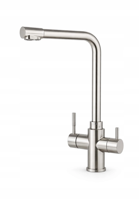 Elegancka bateria kuchenna trójdrożna wykonana z wysokiej jakości stali nierdzewnej 304. Umożliwia podłączenie wody zimnej, ciepłej oraz wody filtrowanej w jednym, estetycznym korpusie – bez dodatkowych kraników przy zlewie.
