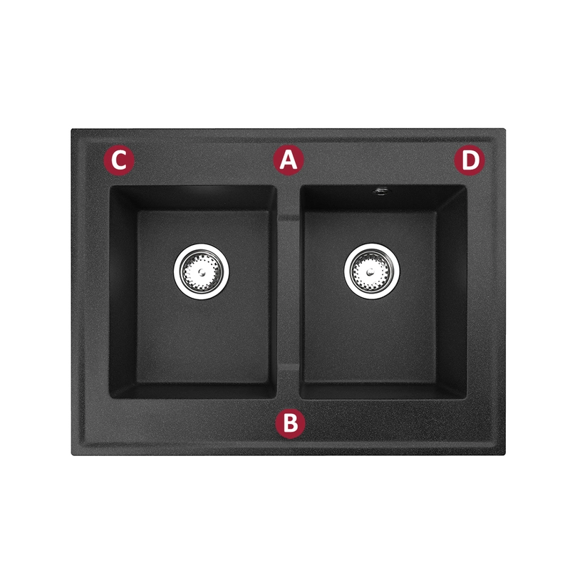Zlewozmywaki posiadają w standardzie dwa otwory A i B, możliwa jest inna konfiguracja otworów, zgodnie z oznaczeniami A-B-C-D.