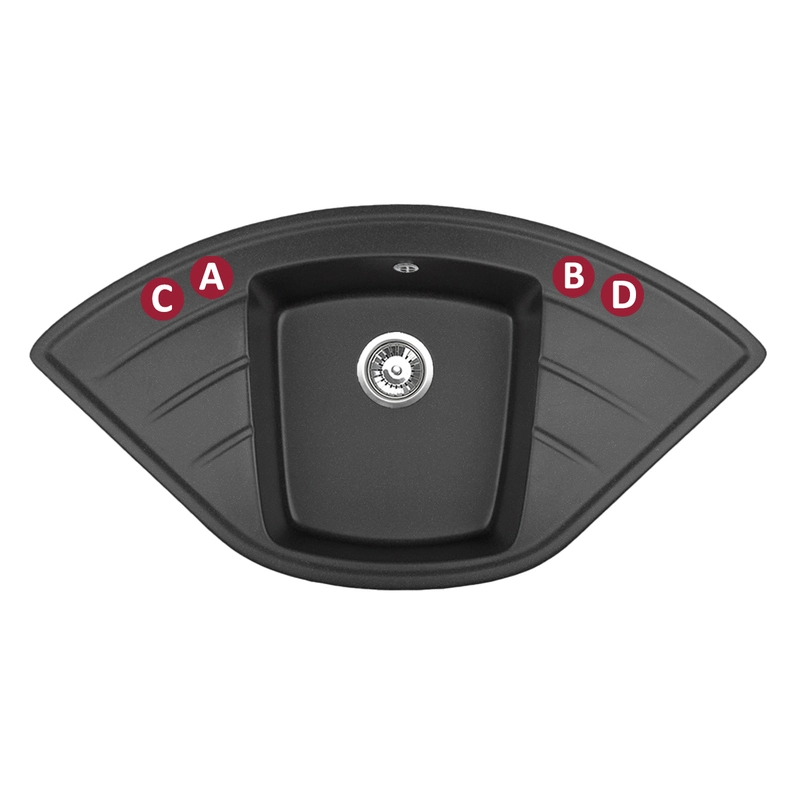Zlewozmywaki posiadają w standardzie dwa otwory A i B, możliwa jest inna konfiguracja otworów, zgodnie z oznaczeniami A-B-C-D.