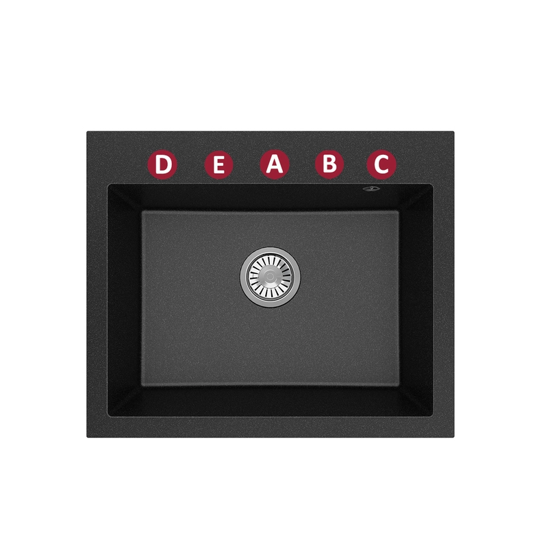 Istnieje możliwość wykonania otworów montażowych (np. na baterię, dozownik) zgodnie ze wzorem na zdjęciu – oznaczenia: A, B, C, D, E.