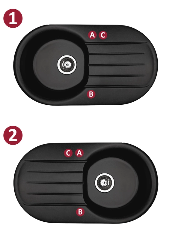Zlewozmywaki posiadają w standardzie dwa otwory A i B, możliwa jest inna konfiguracja otworów, zgodnie z oznaczeniami A-B-C.