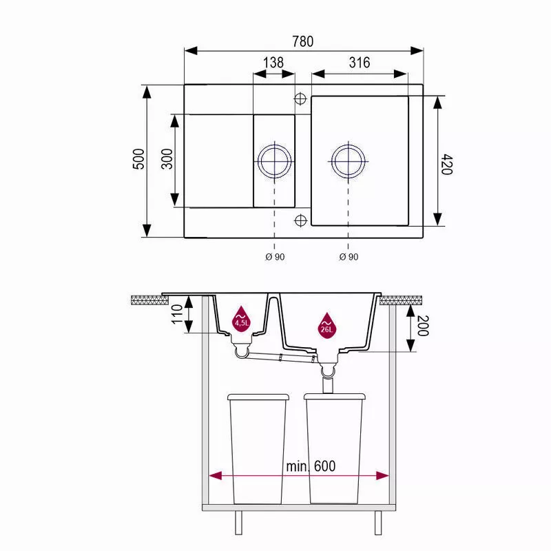 ✅ Montaż wpuszczany w blat jest szybki i bezproblemowy – z pomocą dołączonego szablonu montażowego bez trudu dopasujesz go do swojej kuchni. Dodatkowo istnieje możliwość wykonania otworu na baterię lub dozownik, co zwiększa funkcjonalność zestawu.
