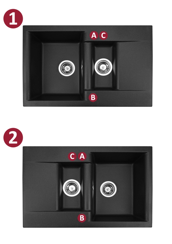Zlewozmywaki posiadają w standardzie dwa otwory A i B, możliwa jest inna konfiguracja otworów, zgodnie z oznaczeniami A-B-C.